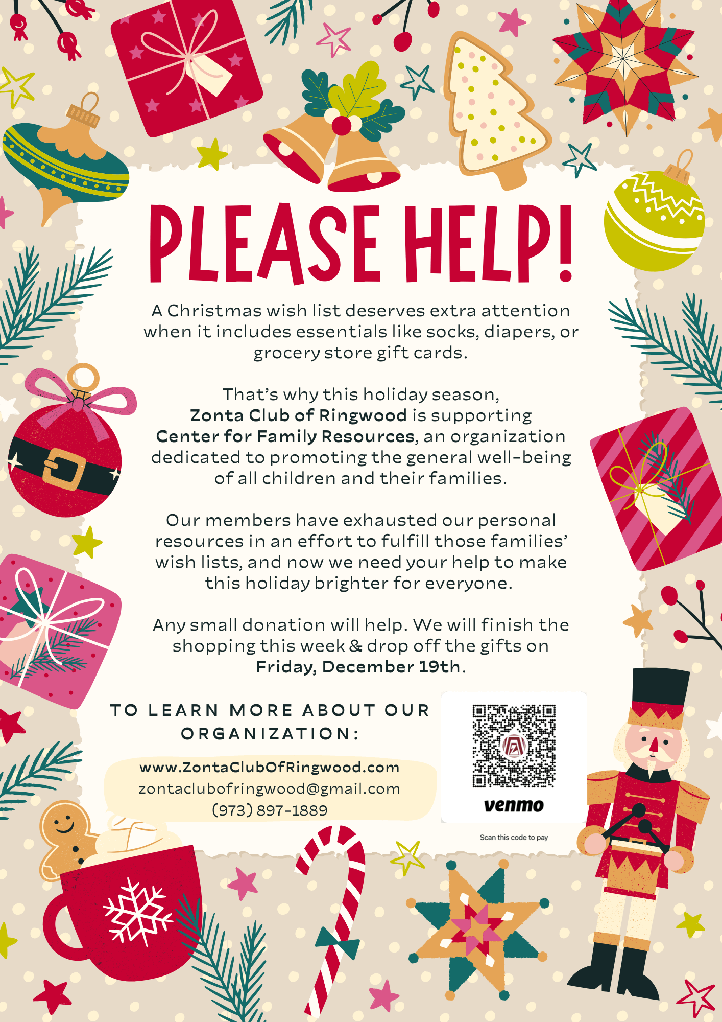 In support of the Center for Family Resources, we are embracing families in need by fulfilling their Christmas wish lists. There is so much need, and we would appreciate any help you could provide to assist us in making a difference. Click the flyer for more info, or scan the QR code to donate through Venmo.